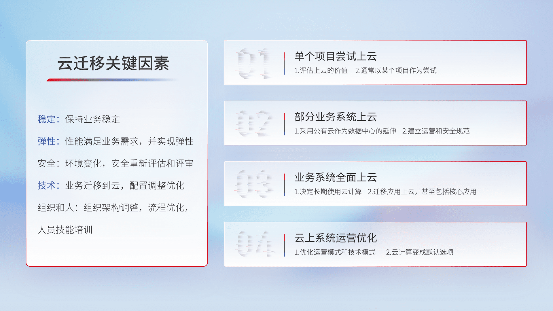 结合实际业务,,,从规划设计、、、、云平台选型、、云原生改造、、数据迁移、、集成交付,,迁移全过程为客户识别最佳上云路径,,,,做好风险识别管理,,,,设计网络架构、、、身份权限、、、、安全审计合规、、操作审计、、、日志审计、、、、监控告警策略、、多站点容灾设计等,,,,对云上基础设施进行整体规划,,,,提升IT治理水平,,以满足弹性、、、、高可用、、、、高性能的需求。。。