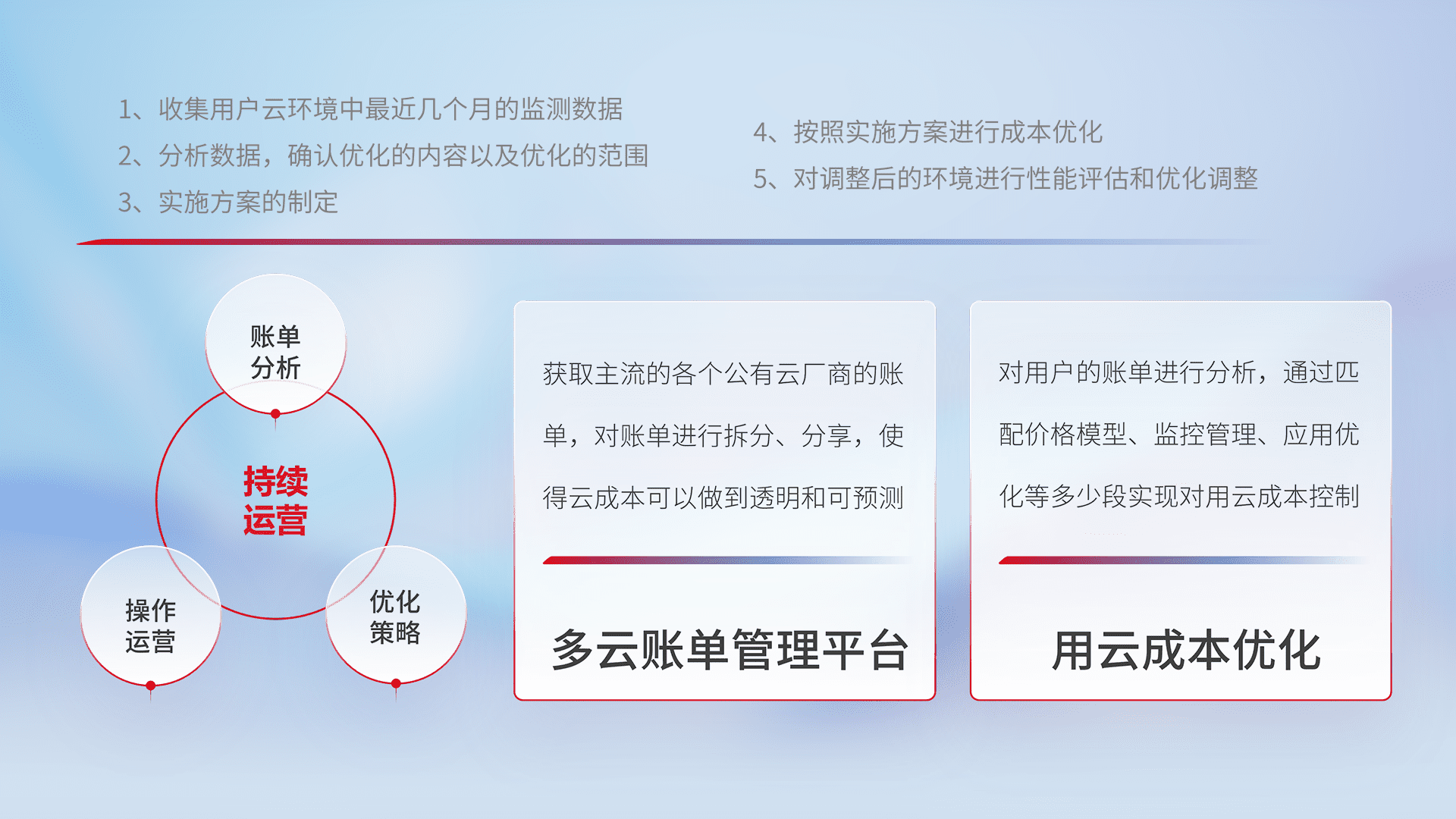 通过多云纳管,,,以统一的资源数据模型把客户的云资源进行抽象和封装,,进而实现对多云资源的统一操作,,,保障云资源管理的可靠性、、、稳定性与可用性。。。。量身定制化运维内容,,,配置、、、开发运维、、、补丁管理、、、备份、、、、监控、、、认证和访问管理、、、审计和日常巡检等,,,保障在用云过程中的可靠度,,稳定度以及高可用率。。。